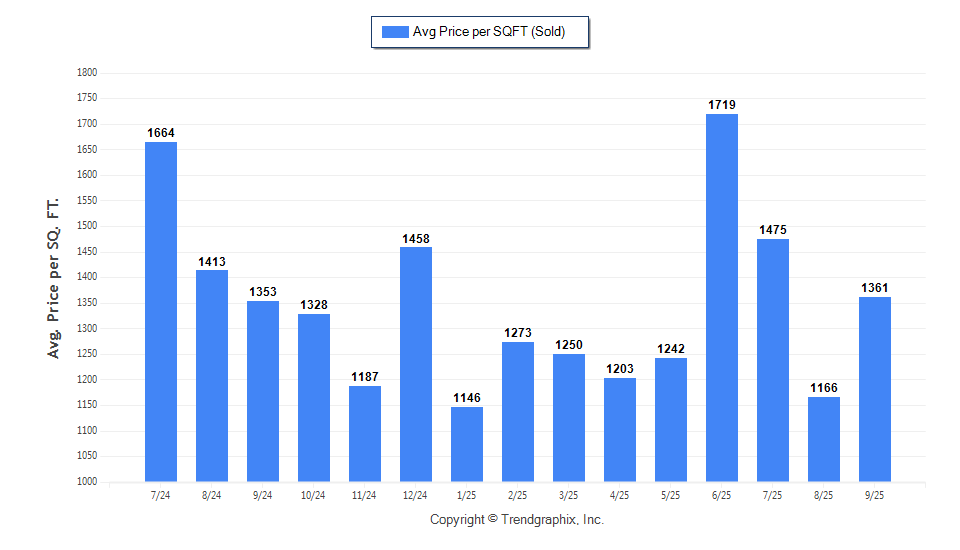 The Average Sold Price per Square Footage is a great indicator for the direction of property values. Since Median Sold Price and Average Sold Price can be impacted by the 'mix' of high or low end properties in the market, the Average Sold Price per Square Footage is a more normalized indicator on the direction of property values. The September 2025 Average Sold Price per Square Footage of $1,361 was up 16.7% from $1,166 last month and up 0.6% from $1,353 in September of last year.