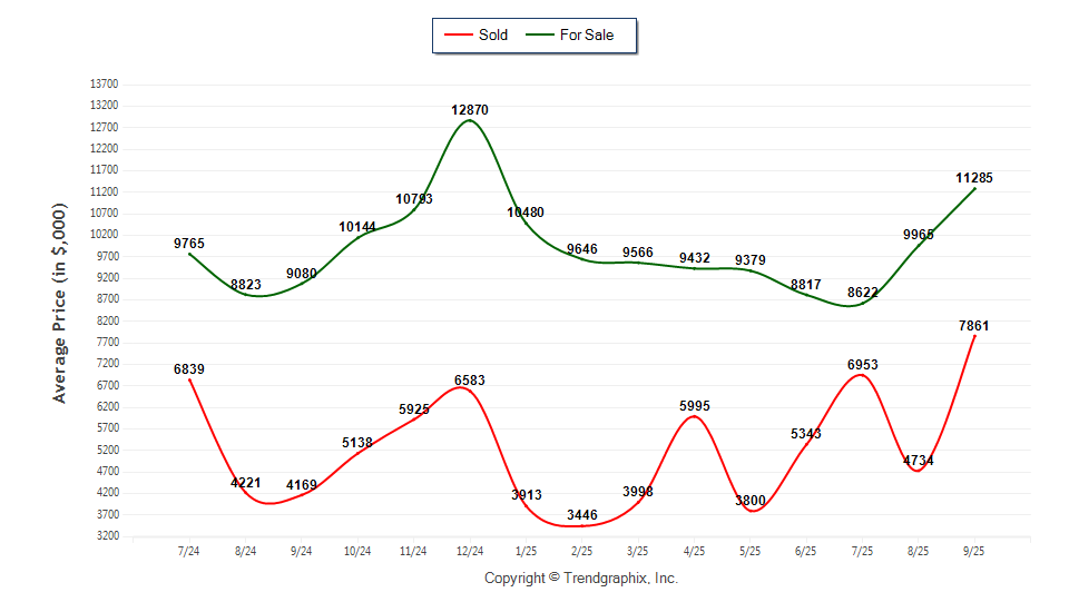 The Average For Sale Price in September was $11,285,000, up 24.3% from $9,080,000 in September of 2024 and up 13.2% from $9,965,000 last month.