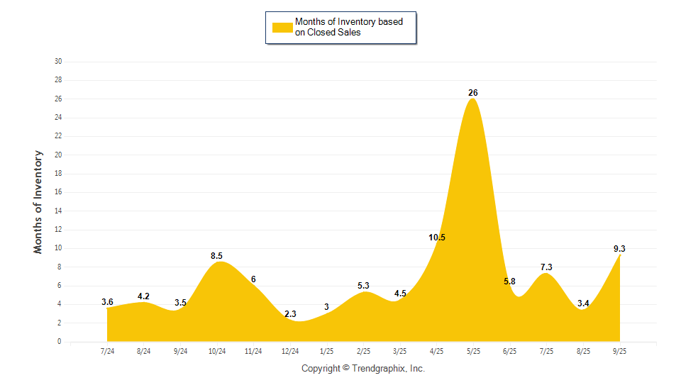 The September 2025 Months of Inventory based on Closed Sales of 9.3 was increased by 165.7% compared to last year and up 174.8% compared to last month. September 2025 was Buyer's market.