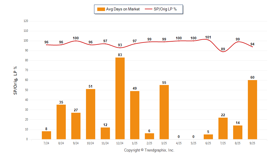 The average Days on Market (DOM) shows how many days the average property is on the market before it sells. An upward trend in DOM trends to indicate a move towards more of a Buyer’s market, a downward trend indicates a move towards more of a Seller’s market. The DOM for September 2025 was 60, up 328.6% from 14 days last month and up 122.2% from 27 days in September of last year.