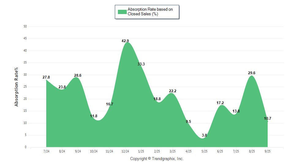 The September 2025 Absorption Rate based on Closed Sales of 10.7 was decreased by 62.6% compared to last year and down 63.8% compared to last month.